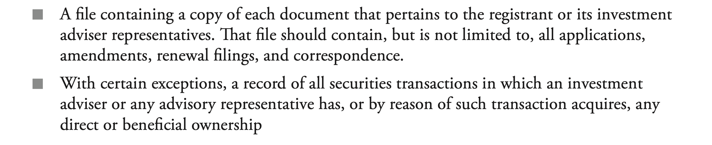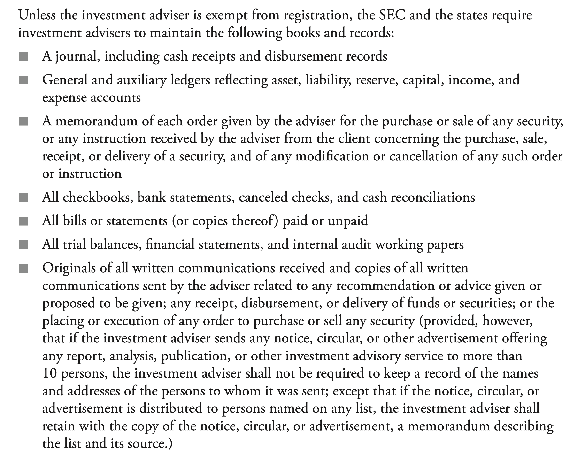 - Balance Sheet Requirement for IAs: if an agreement requires a substantial prepayment, the agreement requires a balance sheet be included int he adviser’s ADV of the most recent fiscal year. It also must be audited by an independent public account. The same more or less applies to state-registered IAs (with the different definition of “substantial”)